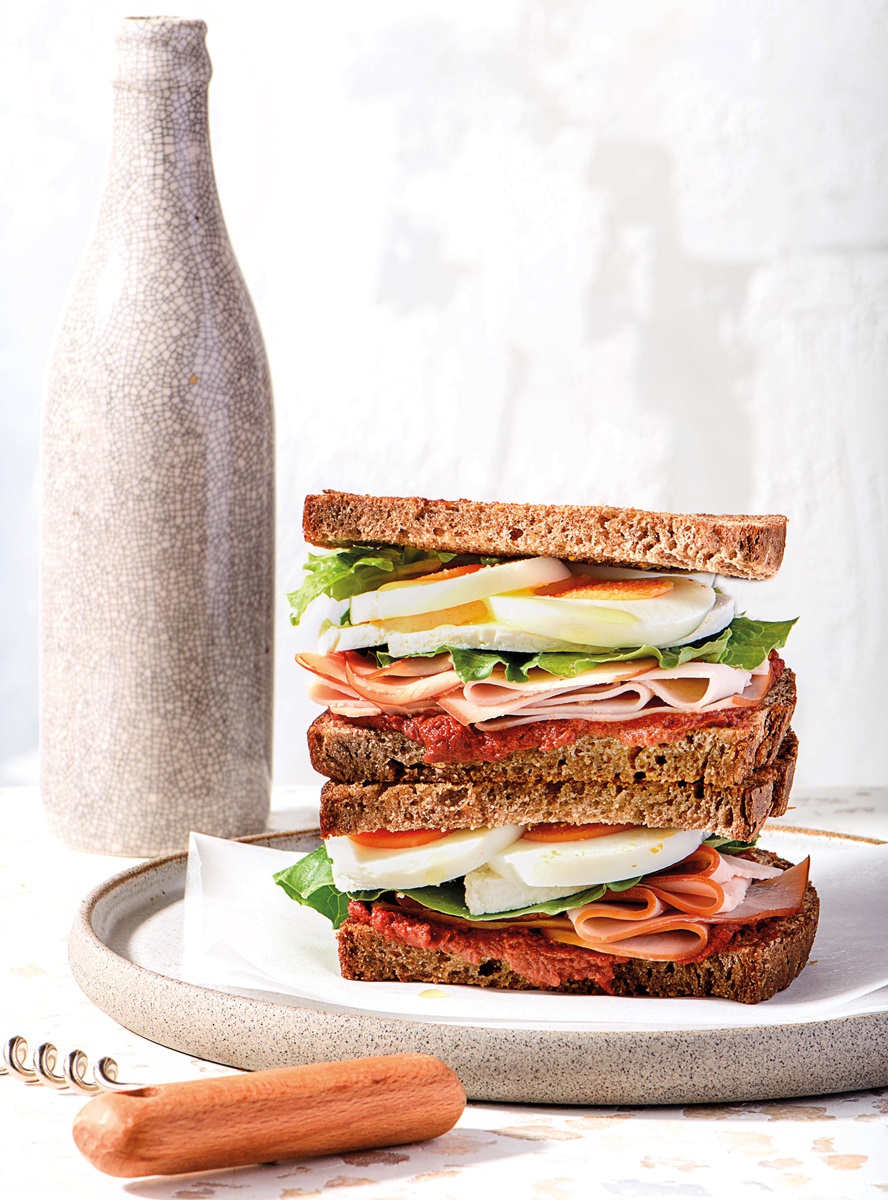 Σάντουιτς ολικής με αυγό, ανθότυρο, πελτέ ντομάτας και γαλοπούλα