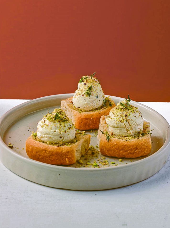 Παξιμαδάκια Κυθήρων με κρέμα ανθότυρου, μέλι και φιστίκι Αιγίνης