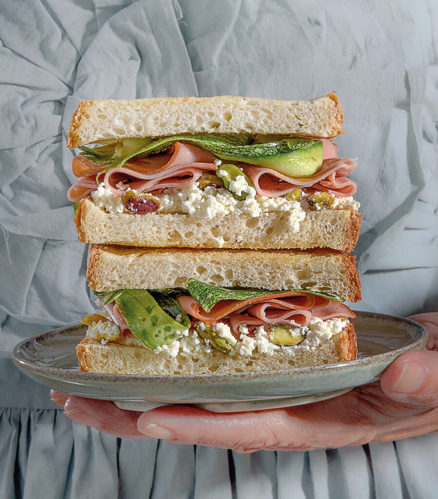 Με προζυμένιο ψωμί, μορταδέλα, κολοκύθι και ξινομυζήθρα
