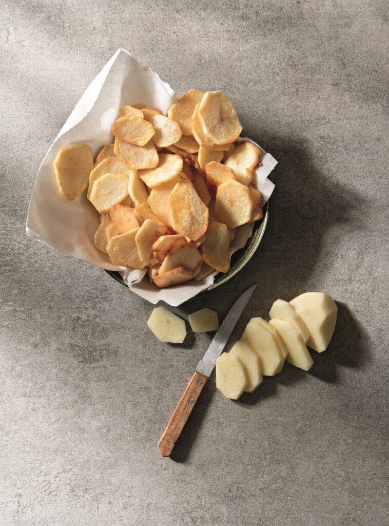 Τις μεταφέρουμε σε χαρτί κουζίνας. Ανεβάζουμε τη θερμοκρασία στους 180ο-190οC και τις ξανατηγανίζουμε (ούτε πολλές ώστε να βράσουν, ούτε και λίγες ώστε να καούν) μέχρι να πάρουν ξανθό χρώμα και να γίνουν τραγανές.