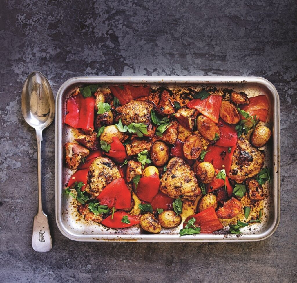 Μπουτάκια κοτόπουλου με πατάτες και κόκκινες πιπεριές