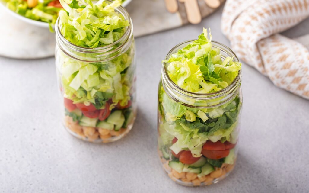 Βάλτε τα «βαριά» υλικά στον πάτο: Αγγούρι, ντομάτα, όσπρια ή ζυμαρικά μπαίνουν στον πάτο του τάπερ. Τα φύλλα σαλάτας ψηλά για να μη πιεστούν.