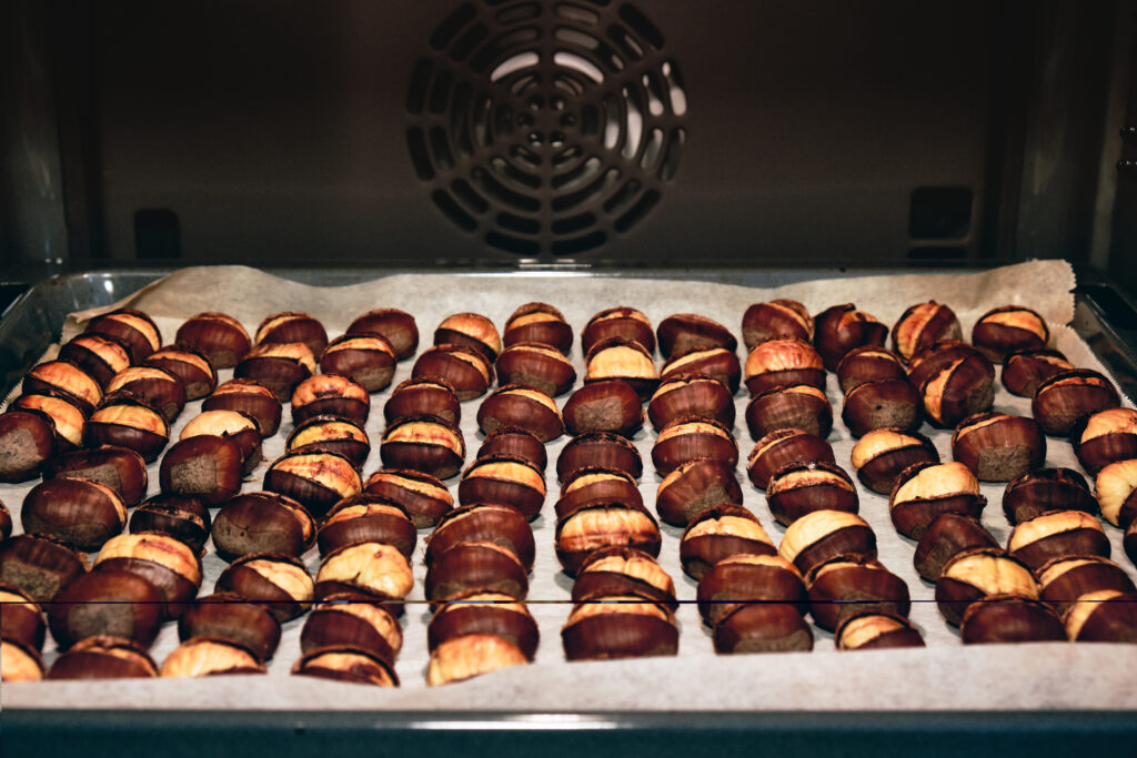 4. Ψήνουμε τα κάστανα για 25-30 λεπτά μέχρι να ανοίξει το κέλυφος και η σάρκα τους να πάρει ελαφρύ χρυσαφένιο χρώμα.