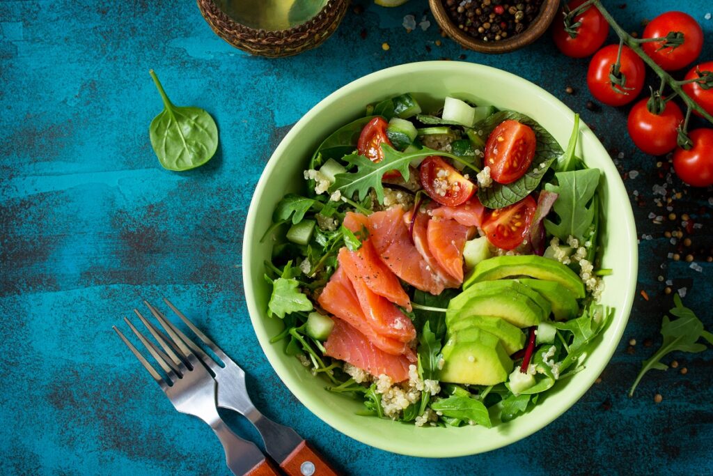 Ζωηρόχρωμο, χορταστικό και γεμάτο αντιοξειδωτικά, αυτό το μπολ συνδυάζει τρυφερές και ζουμερές μπουκιές σολομού με την εύκολη στην προετοιμασία της κινόα και μια πλούσια σάλτσα, που αν την ετοιμάσουμε σε διπλάσια ποσότητα μπορούμε να τη διατηρήσουμε στο ψυγείο για να συνοδεύσει κοτόπουλο ή κάποια σαλάτα με φυλλώδη λαχανικά.