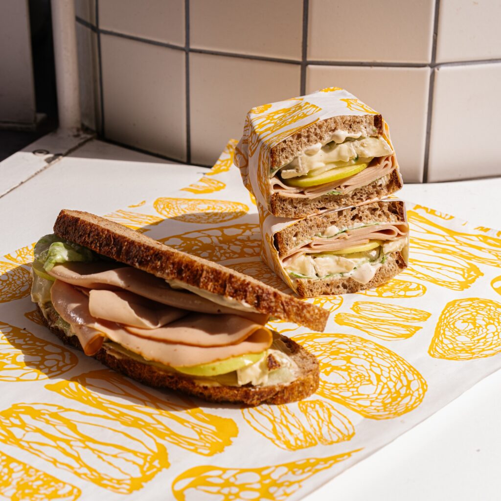 Από τη μεγάλη τζαμαρία του μπορείτε να χαζέψετε τις χορευτικές κινήσεις της ομάδας μέσα στο εργαστήριο όση ώρα θα περιμένετε να ετοιμάσουν κάποιο σάντουιτς. Εμείς επιλέξαμε προζυμένιο ψωμί ολικής άλεσης με γαλοπούλα, λιώμενο μπρι, ελαφριά μαγιονέζα και πράσινο μήλο. Ταυτόχρονα θα έχετε τον χρόνο να επιλέξετε και ό,τι άλλο θα πάρετε μαζί σας: από ψωμί μέχρι κρουασάν, μπισκότα και ρολάκια κανέλας.
