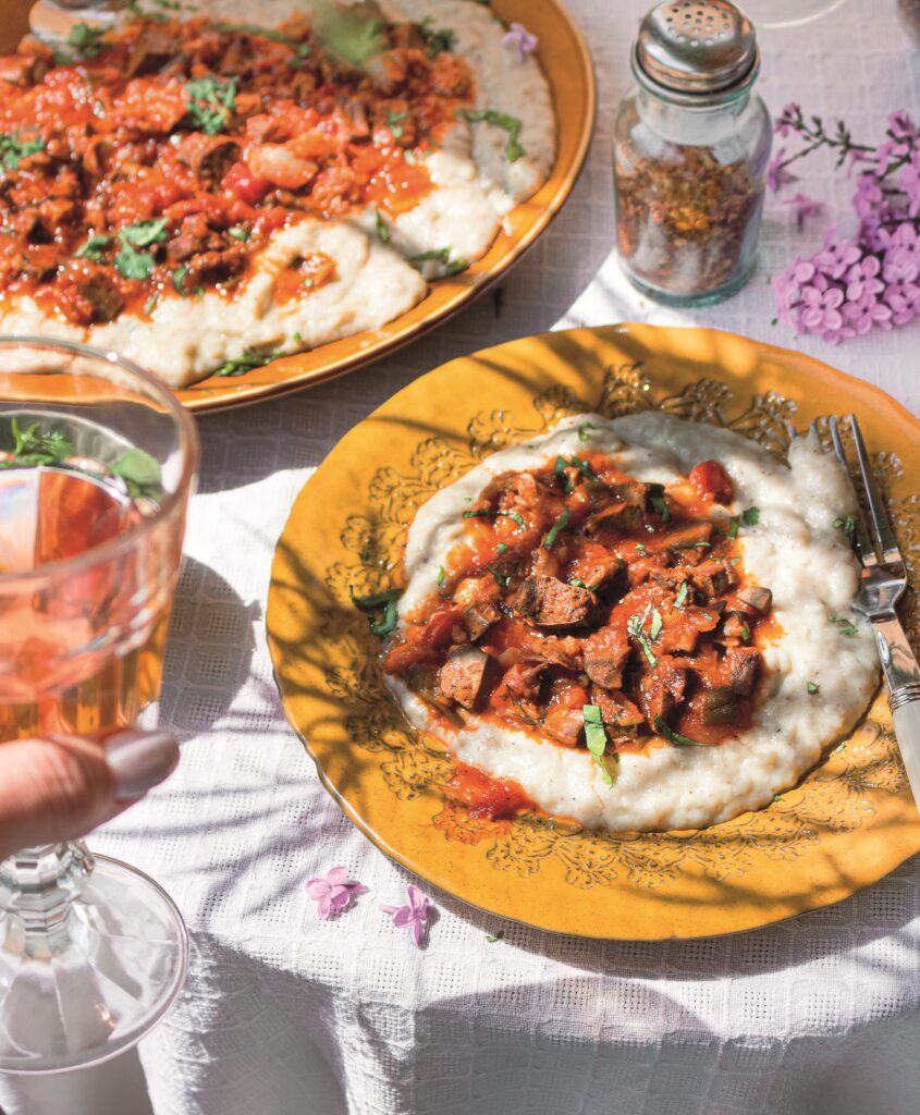 Κοκκινιστή συκωταριά με πουρέ μελιτζάνας