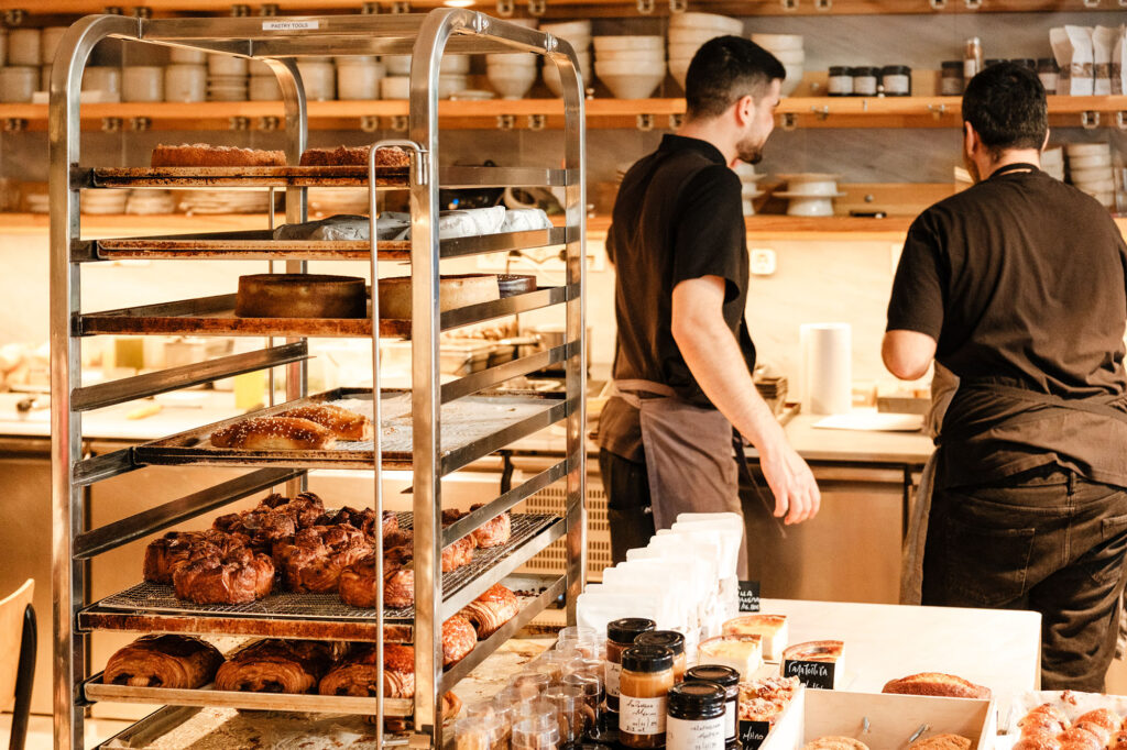 10:30: Αυτή την ώρα πιο τυχεροί είναι εκείνοι που κάθονται για brunch στα δεξιά τραπέζια. Έχουν δίπλα τους όλη τη δράση και τα αρώματα. Μέσα στον φούρνο ψήνονται κουραμπιέδες. Στον πάνω όροφο η ομάδα συνεχίζει πυρετωδώς τις προετοιμασίες γύρω από τον μεγάλο πάγκο. Όλοι μαζί κινούνται με ταχύτητα, που πάντως δεν τους εμποδίζει να μοιραστούν τα νέα τους ή να αστειευτούν, ανάμεσα σε οδηγίες για τις επόμενες προετοιμασίες και ιδέες για την εξέλιξη κάποιας συνταγής.