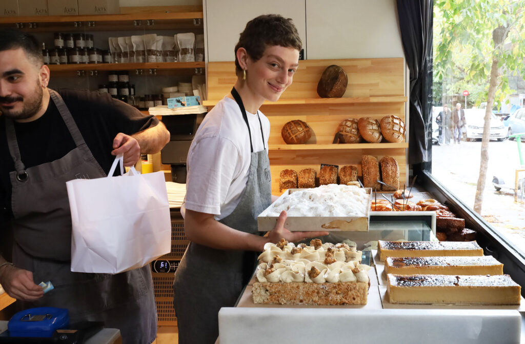 09:00: Οι βιτρίνες γεμίζουν και οι βαριές μαύρες κουρτίνες που κρύβουν τα γλυκίσματα από τα μάτια των περαστικών τραβιούνται στην άκρη. Μια κυρία, από εκείνες τις Παγκρατιώτισσες αριστοκράτισσες μιας άλλης εποχής, είναι η πρώτη που μπαίνει. Θέλει ένα καρβελάκι ψωμί και μπισκότα βουτύρου για το σπίτι. Η ουρά απ’ έξω αρχίζει να σχηματίζεται, ενώ μέσα στήνονται τα τραπέζια για το πρωινό.