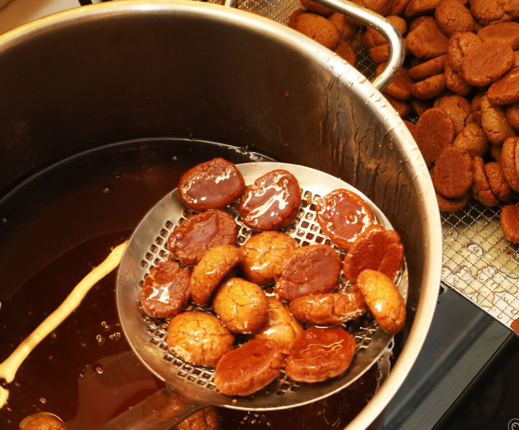 08:00: Ο pastry chef Γιώργος Θυμιάκος δίνει το σύνθημα. Ο πάγκος του αρτοποιείου-ζαχαροπλαστείου γεμίζει λαμαρίνες και γύρω η ομάδα πλάθει τις μπουκίτσες. «Τα μελομακάρονα είναι μια πειραγμένη συνταγή της γιαγιάς από την Κρήτη», λέει ο Πεδιαδιτάκης. Η γιαγιά του Σπύρου τα «βάφτιζε» ζεστά σε ζεστό σιρόπι. Εκείνος προτιμά το σιρόπι να είναι κρύο, ώστε το ζεστό μελομακάρονο να τραβήξει μέσα όλη τη γλύκα, αλλά να μείνει τραγανό απέξω.