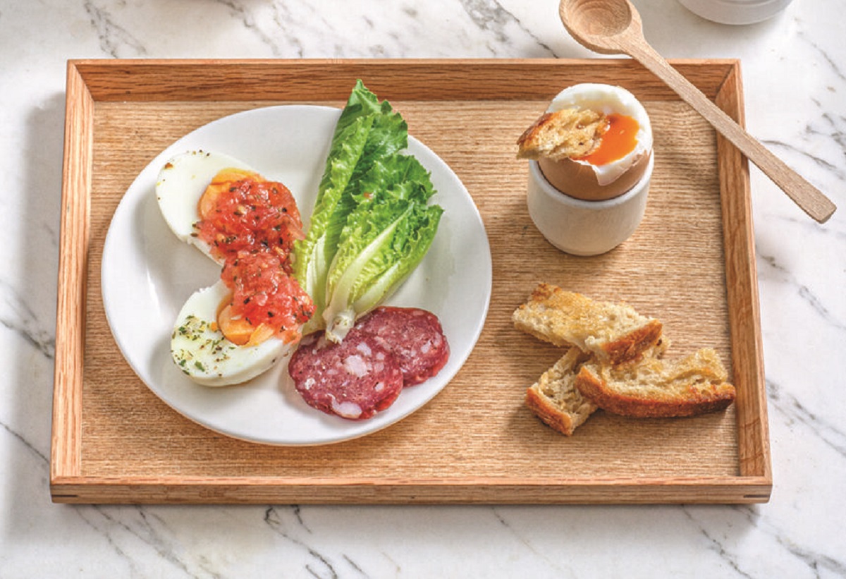 Αυγά βραστά με τριμμένη ντομάτα, σαλάμι Λευκάδος και μαντζουράνα