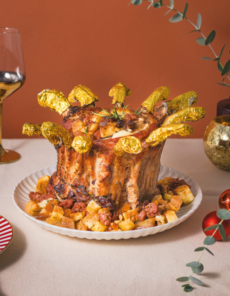 Χοιρινή κορώνα γεμιστή με γιορτινή γέμιση από ψωμί και λουκάνικο