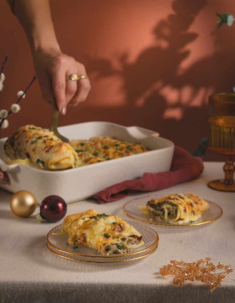 Οι αλμυρές κρέπες στον φούρνο αποτελούν μία εξαιρετική επιλογή για ένα εορταστικό μενού και οι ιδέες για τη γέμιση είναι άπειρες. Εδώ, γεμίζουμε τις κρέπες με κοτόπουλο, μήλο και διάφορα τυριά. Δείτε αναλυτικά τη συνταγή εδώ.