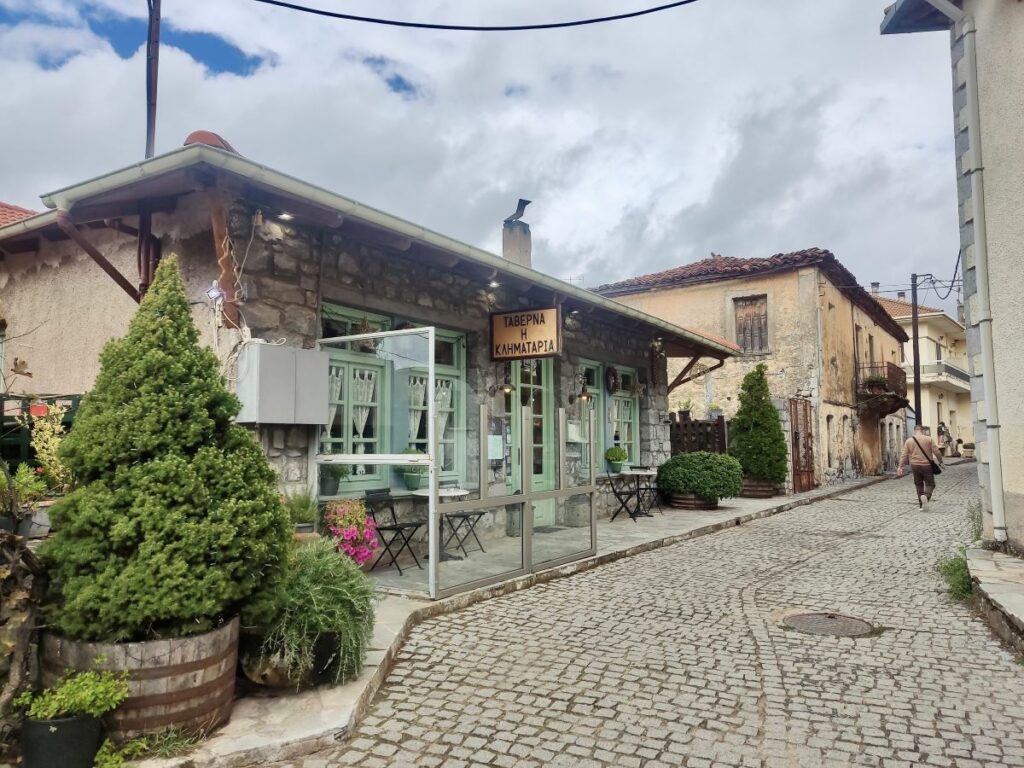 Καθόμαστε με την κόρη της Κατερίνας, την Ελένη, σ’ εκείνο το τραπέζι που βλέπει την πόρτα της κουζίνας. Μου λέει: «Με τον έναν ή τον άλλο τρόπο λειτουργούμε στο χωριό από το 1931. Ο παππούς μου ο Δημοσθένης, από τη μεριά του πατέρα μου, ήταν αυτό που λέμε μερακλής. Ήταν και μορφωμένος. Είχε τελειώσει το σχολαρχείο και πήγε από τη Βυτίνα στην Αθήνα για να μάθει την τέχνη της μαγειρικής. Τότε δεν υπήρχαν σχολές υπήρχε μόνο η εκπαίδευση στη “μάχη”. Τα νέα παιδιά πήγαιναν σε ξενοδοχεία και δούλευαν ως βοηθοί δίπλα στους μάγειρες. Έτσι έκανε και ο παππούς μου. Όταν γύρισε στο χωριό για ν’ ανοίξει την “Κληματαριά”, έφερε μαζί του και την αύρα της μεγάλης πόλης. Και όταν το μαγαζί του άνοιξε, δεν σέρβιρε μόνο μεζέδες. Είχε και πίστα. Έβαλε ένα γραμμόφωνο και οι πελάτες μπορούσαν να χορέψουν. Θα έλεγα πως το μαγαζί του ήταν κάτι σαν συνδετικός κρίκος ανάμεσα στο χωριό και τη μεγάλη πόλη».