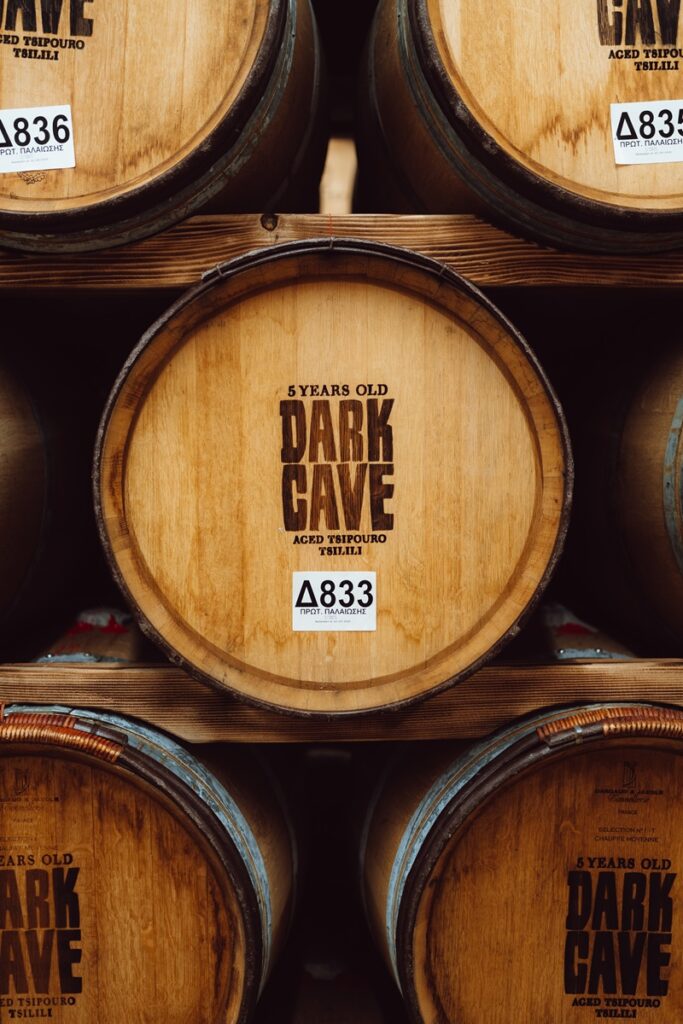Από τα πρώτα χρόνια του αποστακτηρίου ξεκίνησαν πειραματισμοί. «Οι Γάλλοι παράγουν κονιάκ από λευκά κρασιά χαμηλών αρωμάτων και δίνουν χαρακτήρα μέσω των βαρελιών. Εμείς έχουμε ήδη αρωματικά σταφύλια και σκέφτηκα ότι μπορούμε να τα εξελίξουμε μέσα στο ξύλο», εξηγεί. Έτσι γεννήθηκε το Dark Cave. «Μπαίνει σε βαρέλια γαλλικά και αμερικάνικα, που είχαν χρησιμοποιηθεί για κόκκινο κρασί, και τον τελευταίο χρόνο σε βαρέλια από Vinsanto. Εκεί αποκτά τον ιδιαίτερο χαρακτήρα και βάθος», λέει ο Τσιλιλής.