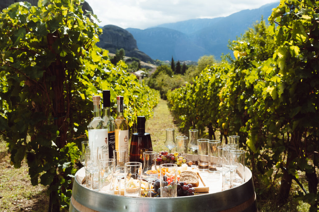 Φεύγοντας από το αποσταγματοποιείο, κατευθυνόμαστε προς τους πρόποδες των Μετεώρων, εκεί όπου οι βράχοι αγγίζουν τον ουρανό και τα αμπέλια απλώνονται σαν φυσική προέκταση του τοπίου. Ο Κώστας Τσιλιλής μιλά με σεβασμό και συγκίνηση για έναν τόπο που «κουβαλάει ιστορία, παράδοση και μνήμη», τον ιστορικό βιολογικό αμπελώνα της Μονής Μεγάλου Μετεώρου, φυτεμένο για πρώτη φορά το 1350. Η σημερινή φύτευση, ολοκληρωμένη το 2013 σε έκταση 25 στρεμμάτων, περιλαμβάνει ποικιλίες όπως Μαλαγουζιά, Ασύρτικο και Μοσχάτο Αλεξανδρείας. Από τα σταφύλια αυτά παράγεται και το Νάμα για τη Μονή του Μεγάλου Μετεώρου.
