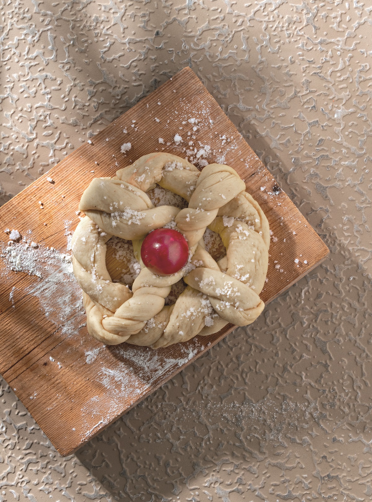 Τέλος, στο κέντρο του σταυρού τοποθετούμε και ένα κόκκινο αυγό. Ψήνουμε σε προθερμασμένο φούρνο στους 180°C για 50 περίπου λεπτά.
