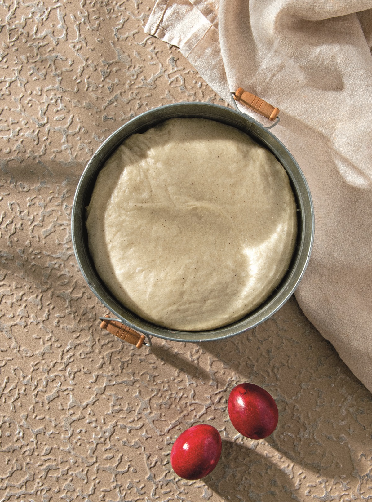 Βυθίζουμε το κόκκινο αυγό μέχρι τη μέση του, γιατί όταν φουσκώσει η ζύμη, θα ανέβει επάνω.
