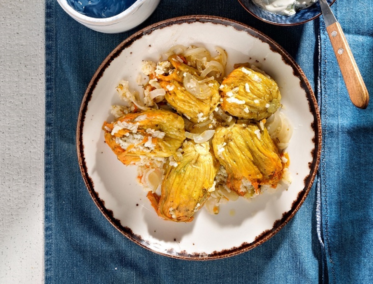 Σε αυτή τη συνταγή γεμίζουμε κολοκυθοανθούς με ρύζι και λαχανικά και συνοδεύουμε το καλοκαιρινό αυτό πιάτο με δροσερή σάλτσα γιαουρτιού. Δείτε αναλυτικά τη συνταγή εδώ.