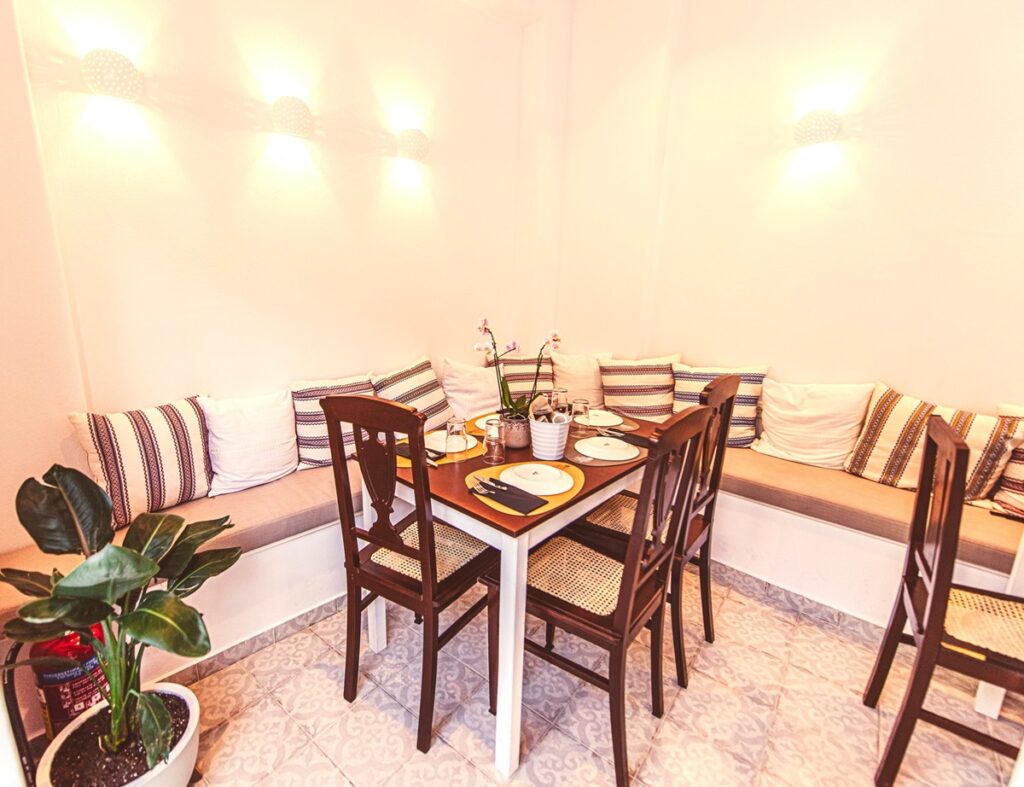 Μια παλιά πετρόχτιστη «προστεάδα» -έτσι αποκαλούνται τα μικρά, υποτυπώδη κτίσματα όπου οι χωριανοί στέγαζαν και προφύλασσαν τα ζώα και το φαγητό τους, αλλά και αποθήκευαν τα εργαλεία των καθημερινών τους εργασιών-, ένας τέτοιος στάβλος και αποθήκη μαζί, ήταν το μόνο που υπήρχε στο οικόπεδο που αγόρασε ο σεφ και ιδιοκτήτης της Σαρωνιάς κ. Κώστας Καρποντίνης, για να δώσει υπόσταση στο όνειρό του: να ανοίξει δηλαδή το δικό του χώρο εστίασης στο χωριό του και να προσφέρει την καλύτερη εκδοχή των γεύσεων με τις οποίες κι ο ίδιος μεγάλωσε, τα πιάτα που τιμούν τη Νάξο, την παράδοσή της και τους ανθρώπους που μοχθούν απ’ άκρη σ’ άκρη στη γη της.