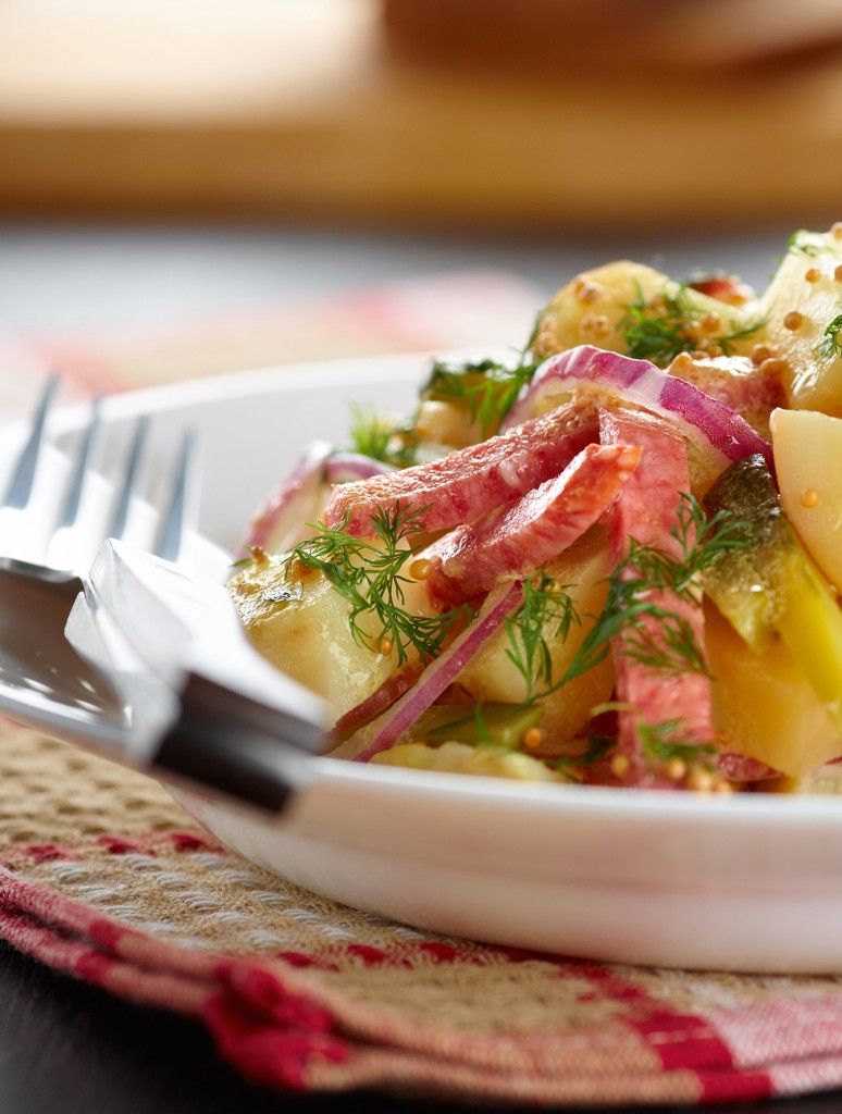Πατατοσαλάτα πικάντικη με σαλάμι, κρεμμύδι, άνηθο και σάλτσα μουστάρδας