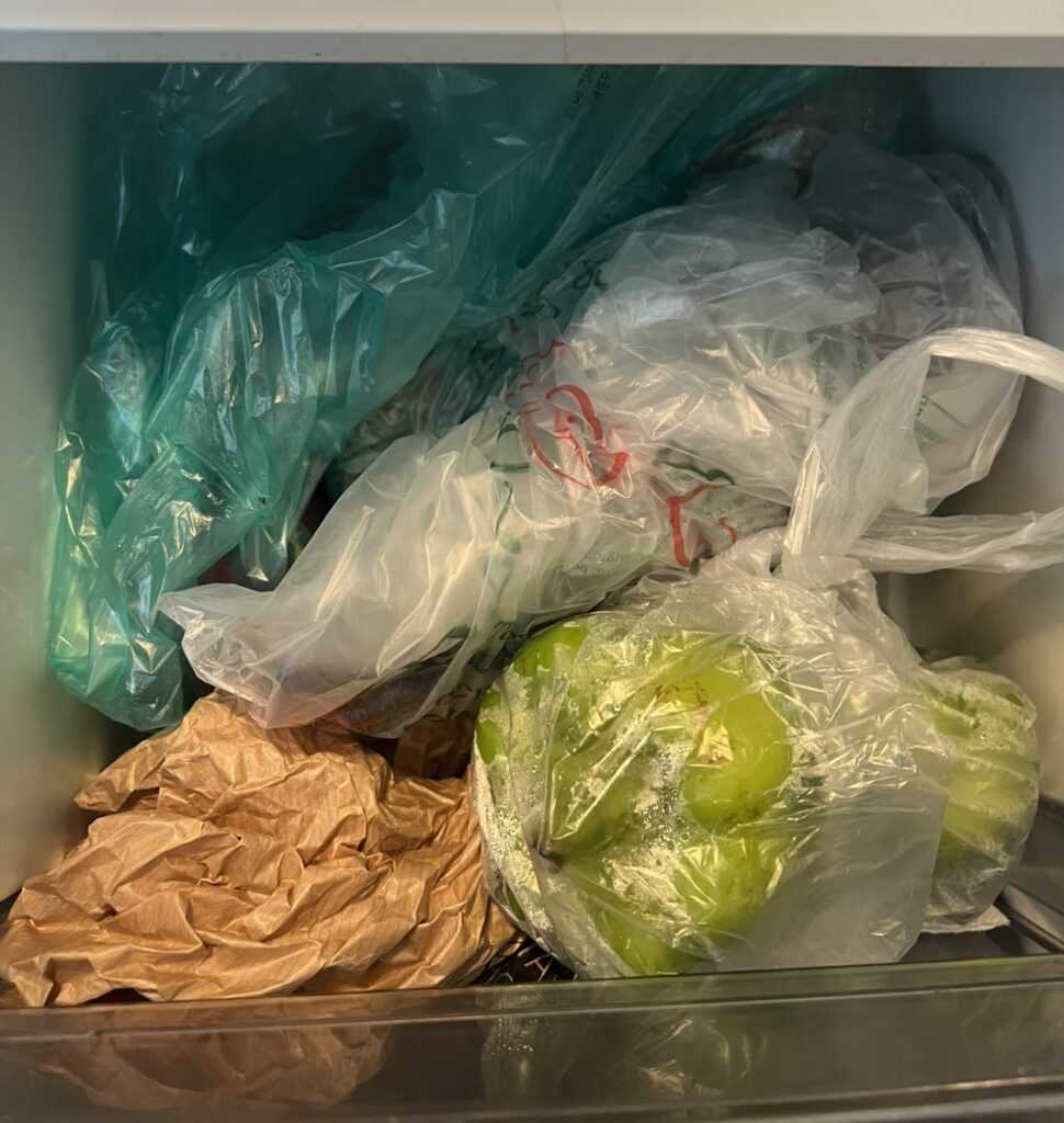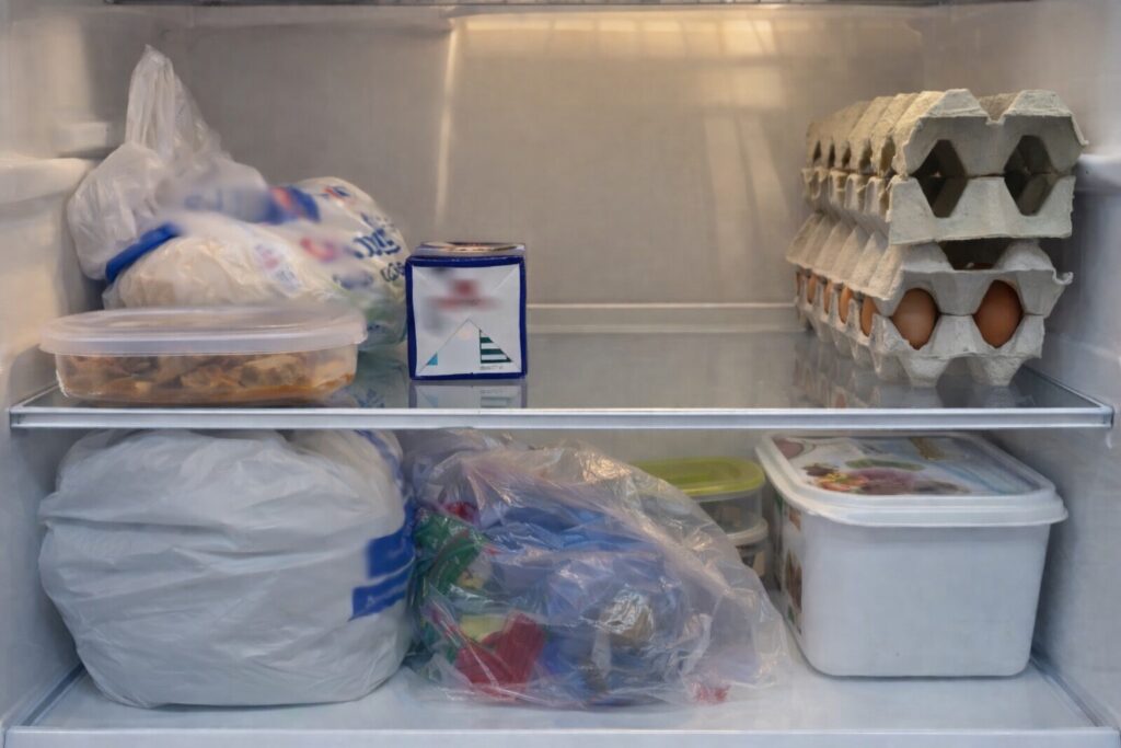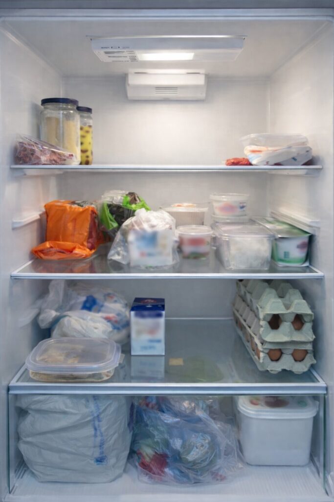 Η πρώτη παρατήρηση δεν αφορούσε κάποιο συγκεκριμένο τρόφιμο αλλά τη συνολική εικόνα του ψυγείου. Τα ράφια ήταν αρκετά γεμάτα, με σακούλες και δοχεία τοποθετημένα το ένα δίπλα στο άλλο. «Τα τρόφιμα διατηρούνται ασφαλή όταν κυκλοφορεί ο ψυχρός αέρας. Αν γεμίσουμε το ψυγείο μέχρι πάνω, αυτή η κυκλοφορία μπλοκάρεται», αναφέρει. Η ψύξη βασίζεται ακριβώς σε αυτή την κυκλοφορία του αέρα. Όταν το ψυγείο είναι υπερφορτωμένο, η θερμοκρασία δεν κατανέμεται σωστά και κάποια τρόφιμα αλλοιώνονται πιο γρήγορα. Στην πράξη, όπως εξηγεί, ένα ψυγείο δεν θα πρέπει να είναι γεμάτο πάνω από περίπου το 60% της χωρητικότητάς του.