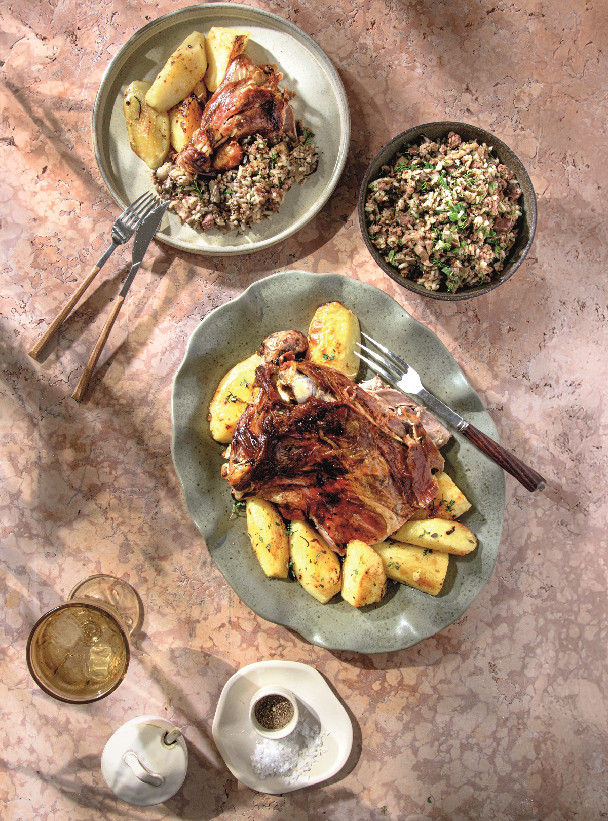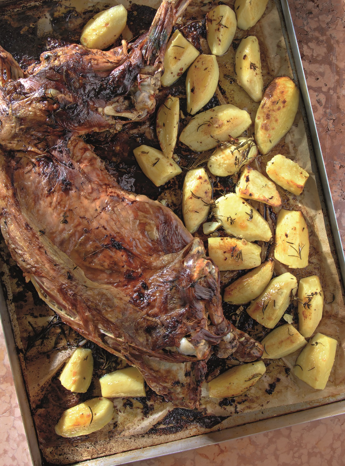Το γεμιστό αρνί απαιτεί πολύωρο μαγείρεμα, γι’ αυτό τα συνοδευτικά μπαίνουν στο ταψί περίπου 1 ώρα πριν το τέλος του ψησίματος.
