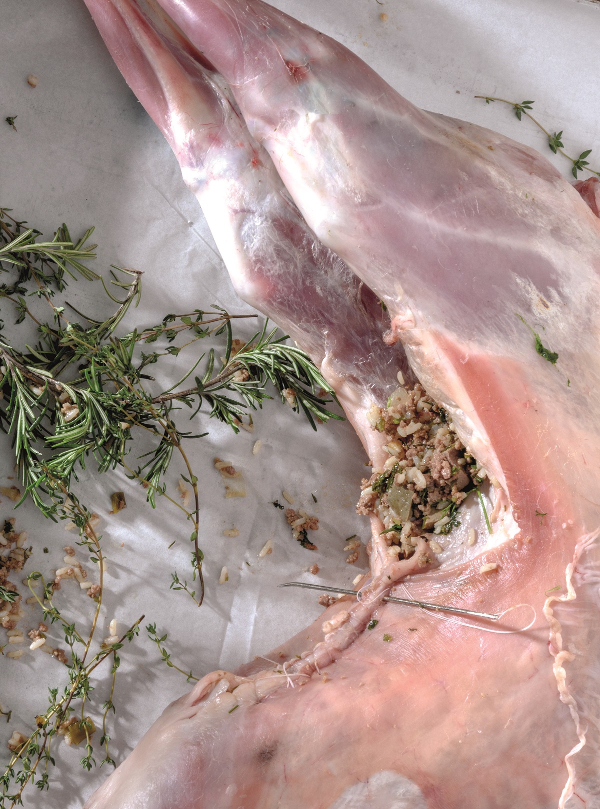 Αρνί: Προθερμαίνουμε τον φούρνο στους 180°C στον αέρα. Αλατοπιπερώνουμε το κρέας και το γεμίζουμε με τη φάρσα στην κοιλιά. Το ράβουμε κατά μήκος της κοιλιάς με σπάγκο μαγειρικής και το τοποθετούμε σε ένα μεγάλο ταψί. Ρίχνουμε τον χυμό των λεμονιών και το υπόλοιπο λάδι, προσθέτουμε νερό και πασπαλίζουμε με το θυμάρι και το δεντρολίβανο.