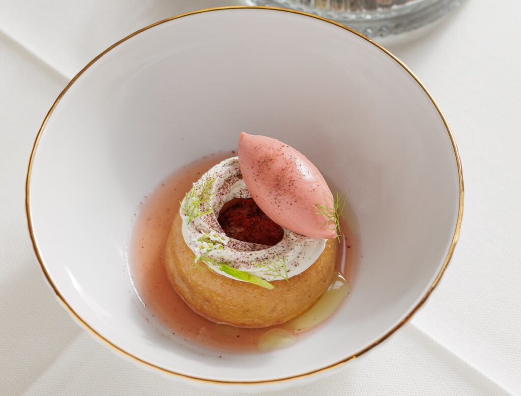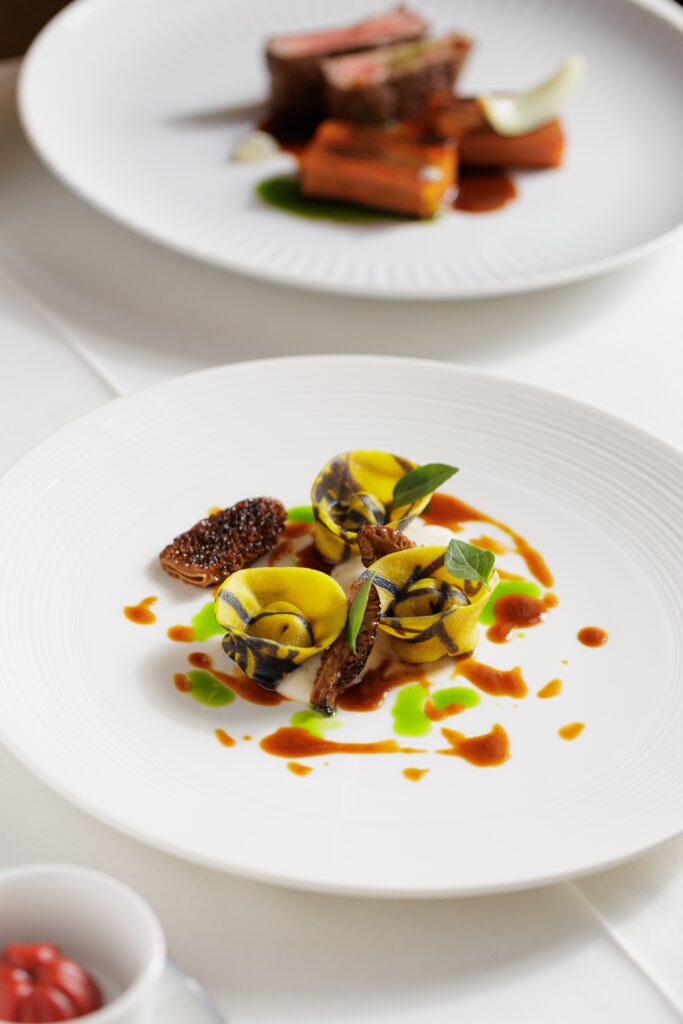 Θα σταθώ επίσης στην τσιπούρα με πρασοσέλινο και αχλάδι – ναι αχλάδι. Το ψήσιμο του ψαριού ήταν ακριβές, τα φύλλα σέλινου, το σέλερι κονφί, τα κυβάκια αχλαδιού και τα μαγειρεμένα πράσα του έδιναν γλύκα και υφή. Καθώς και στα ζυμαρικά cappelletti με άγρια μανιτάρια και μουρχέλες, σε μια πιο comfort εκδοχή, με μια ανάλαφρη μπεσαμέλ από γραβιέρα Νάξου που δεν βάραινε το σύνολο. Το φιλέτο μοσχαριού, ως τελευταίο αλμυρό, έκλεισε τον κύκλο με πληρότητα: σωστά ψημένο, με καρότα που είχαν σπετσερικό.