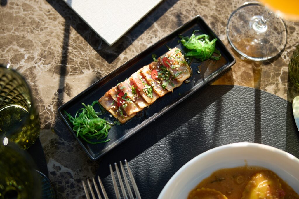 Ο σχετικά ασυνήθιστος συνδυασμός θάλασσας και οσπρίων εκφράζεται εδώ με ζουμερή «σφυρίδα στη σχάρα πάνω σε σαλάτα από ρεβίθια, φινόκιο, πράσινα φασολάκια και κυβάκια γλυκοπατάτας». Η πίκλα τζίντζερ και οι πέρλες λεμονιού που συνοδεύουν το πιάτο εξισορροπούν το άμυλο του ρεβιθιού και της γλυκοπατάτας.