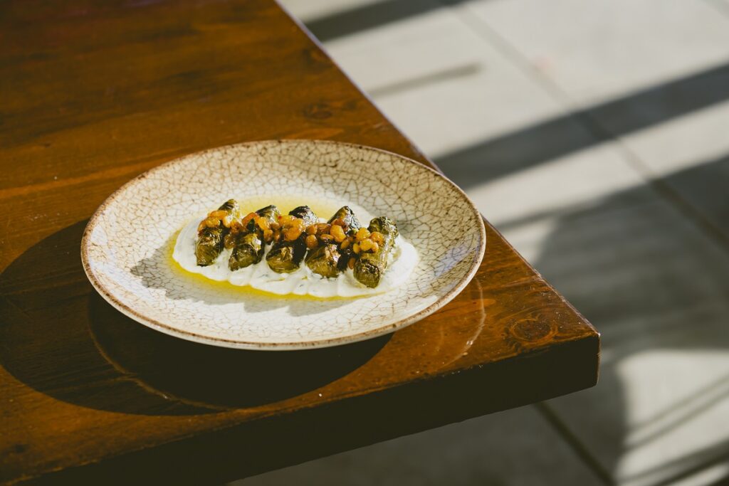 Από το μικρό μενού, διαλέγουμε αμέσως «χειροποίητα ντολμαδάκια στη φωτιά με συνοδεία γιαούρτι πικάντικο με σταφίδες και κουκουνάρι». Αν σας λένε κάτι τα κασιώτικα ντολμαδάκια, λεπτά σαν το μικρό δάχτυλο του χεριού και τσουπωτά, έτσι είναι κι εδώ. Μια μπουκιά το καθένα, με ορεκτικό καπνιστό άρωμα από την πυρά απ’ όπου πέρασαν. Μια βουτιά στο ελαφρώς καυτερό γιαούρτι με απόηχους από την μικρασιάτικη κουζίνα, όπως πλουτίζεται από τα κουκουνάρια και τις σταφίδες, ανεβάζει την ένταση. Ένα πιάτο που θα παραγγείλετε οπωσδήποτε.