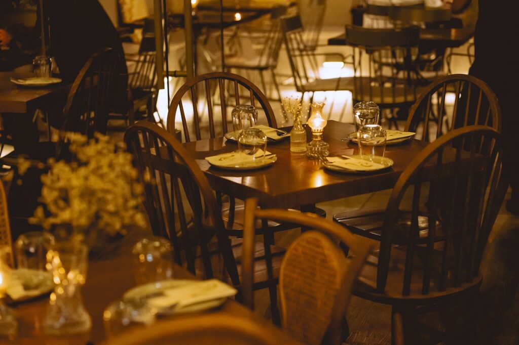 Ρίχνουμε μια ματιά τριγύρω περιμένοντας τα κυρίως πιάτα. Αισθητική φρέσκια και ανοιχτόκαρδη, με τη ζεστασιά του ξύλου σε λευκό φόντο στη σάλα με το όμορφο μπαρ στο πίσω μέρος.