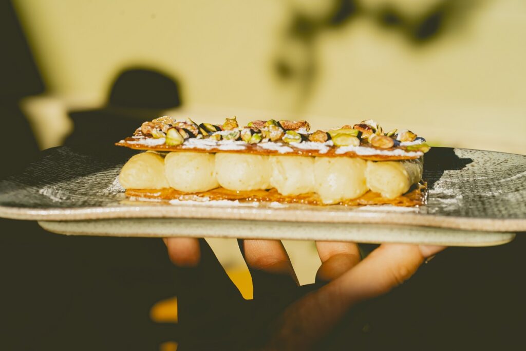Φτάνοντας στο τέλος του γεύματος, όσοι λαχταρούν τη γευστική γενναιοδωρία του «ωραίου γλυκού της Κυριακής» και τα πλούσια σιροπιαστά του ταψιού, θα ψιθυρίσουν «αλληλούια». «Πορτοκαλόπιτα σιροπιαστή με κρέμα πορτοκάλι, αρωματισμένη με λουίζα, και σορμπέ πορτοκάλι», «μπακλαβάς μιλφέιγ (πολύ τραγανά τα φύλλα) με κρέμα φυστίκι» και ένα μαστιχωτό «εκμέκ τσουρέκι με κρέμα μαχλέπι και παγωτό καϊμάκι». Αυτό το τελευταίο, μας άρεσε πολύ. Όχι πολύ γλυκό, όχι πολύ σιροπιαστό, με μαστιχωτό τσουρέκι, όπως το αυθεντικό τούρκικο εκμέκ, με άρωμα από το μαχλέπι και έξοχο παγωτό.