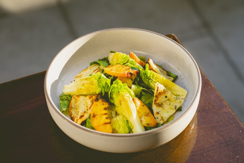 Δροσερό και τραγανό διάλειμμα από τις παραπάνω εντάσεις, η «σαλάτα με καρδιές μαρουλιού, ροδάκινο, ρόκα και ψητό ταλαγάνι και dressing από ρακόμελο». Η γλυκόξινη φρεσκάδα του ροδάκινου και το ευρηματικό dressing από ρακόμελο επιμένουν να φωνάζουν καλοκαίρι, ενώ το ημερολόγιο δείχνει προς τον χειμώνα.