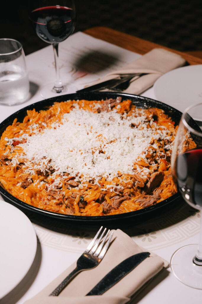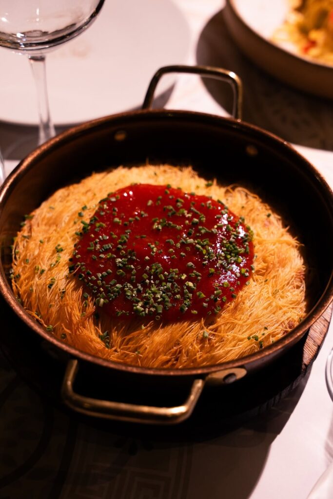 Στη συνέχεια ήρθαν στο τραπέζι τα πιο comfort πιάτα της βραδιάς. Ξεχωρίζει η τυρόπιτα κανταΐφι, που σερβίρεται σε ζεστό μαντεμένιο σκεύος, με μπόλικα τυριά, τσορίζο Δράμας και μαρμελάδα ντομάτας, ελαφρώς αλμυρή και άκρως απολαυστική, ειδικά αν αγαπάς τα τυριά.