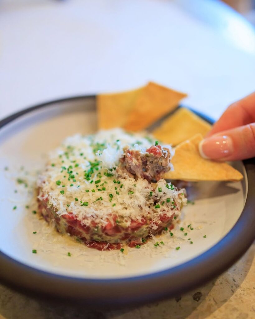 Από τα ορεκτικά φάνηκε πως πρόκειται για ένα αρκετά κρεατοφαγικό και γενναιόδωρο στα πιάτα του μαγαζί. Ξεκινήσαμε με το καρπάτσιο ελληνικής μοσχίδας, με γαλάκτωμα τρούφας, φιστίκι, ρόκα, κάπαρη και ανθό αλατιού, και συνεχίσαμε με μια ακόμη ωμή κοπή: ταρτάρ μοσχαρίσιο με τραγανή τορτίγια.