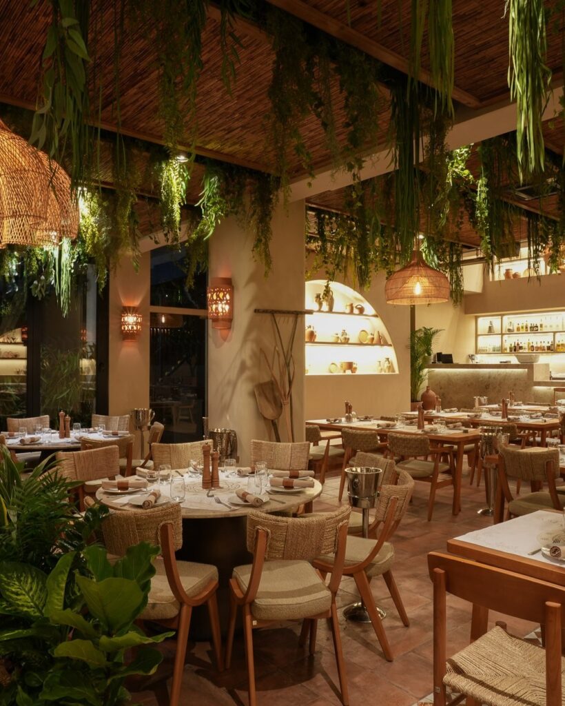 Από την πρώτη στιγμή, το μαγαζί σου κάνει εντύπωση με το πόσο ευρύχωρο και φωτεινό είναι, με φυτά που κρέμονται από το ταβάνι και μια ανοιχτόχρωμη, ήρεμη παλέτα που σε χαλαρώνει. Τα μεγάλα τραπέζια και η πίστα που αρχίζει να στήνεται όσο περνά η ώρα σε προετοιμάζουν για κάτι παραπάνω από ένα απλό δείπνο.