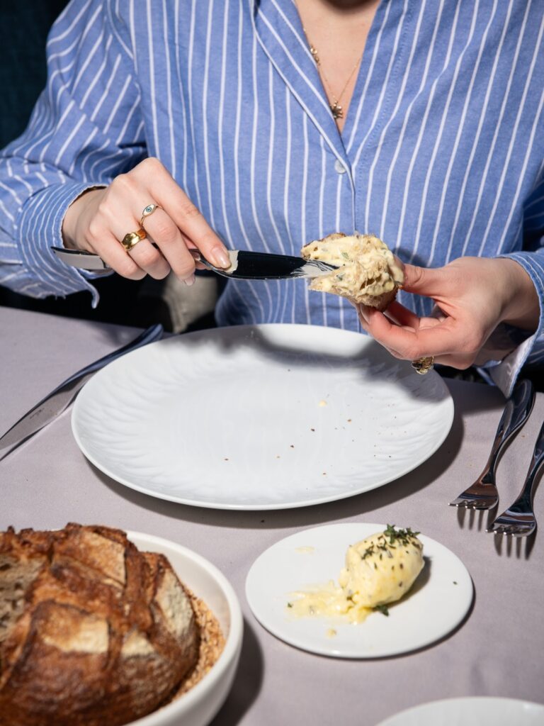 Το δείπνο μας άνοιξε με προζυμένιο ψωμί, εξαιρετικό παρθένο ελαιόλαδο από κορονέικες ελιές και αρωματικό βούτυρο με μαντζουράνα, θυμάρι, λεμόνι και αλάτι.
