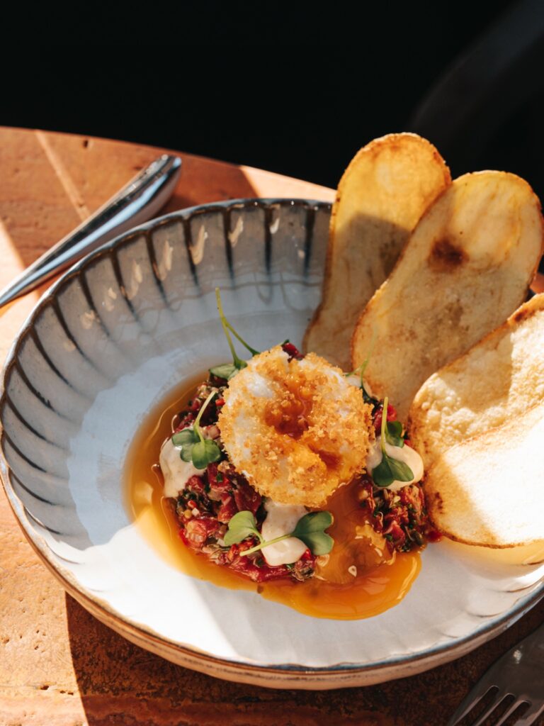 Ακολούθησε ένα από τα πιο αγαπημένα μου πιάτα της γαλλικής κουζίνας σε μια εκδοχή εξόχως ενδιαφέρουσα: Μοσχαρίσιο ταρτάρ με παναρισμένο κρόκο αυγού, πίκλα μουστάρδας, αφρό τυριού, nduja και τσιπς πατάτας στο πλάι του.