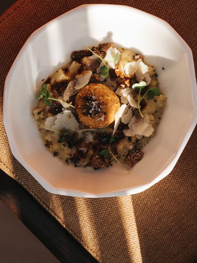 Έξυπνη ιδέα το «ριζότο» πατάτας -το «πατατότο», σύμφωνα με τον χαμογελαστό σεφ- με παναρισμένη κροκέτα σιγομαγειρεμένης μοσχαρίσιας ουράς, παρμεζάνα, τρούφα και μοσχαρίσιο ζωμό. Μου έλειψε λίγο χύλωμα στην πατάτα για να παίξει στα σοβαρά την κόντρα με την τραγανή κροκέτα, αλλά συνολικά η γεύση ήταν ένα ήπιο χάδι, χωρίς έντονες αντιθέσεις.