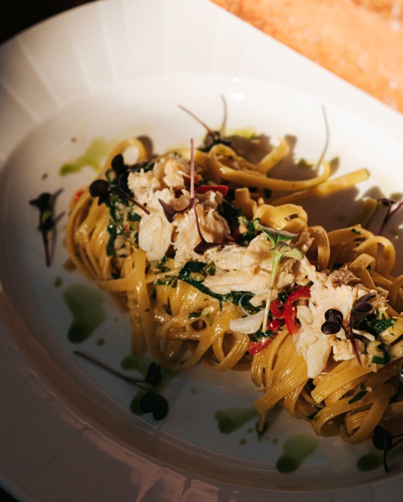 Συνεχίσαμε με tagliolini λεμονάτα, επιτυχώς al dente, με καβούρι, τσίλι και ξύσμα λεμονιού Ένα πιάτο που φλερτάρει την Thai κουζίνα χωρίς να χάνει την επαφή της με τη Μεσόγειο. Μια πραγματικά έξυπνη ιδέα με σοβαρή υλοποίηση.
