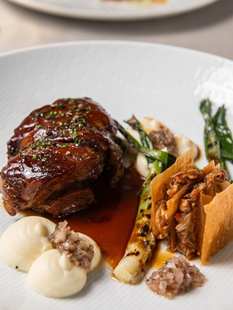 Και κλείσαμε με την ζουμερή, μαγειρεμένη για πάνω από δώδεκα ώρες σπάλα αρνιού, με τη βαθιά ζωική γεύση. Στο πλάι της, πουρές από μήλο και σελινόριζα, καμένο φρέσκο κρεμμύδι και πίκλες από εσαλότ και εστραγκόν δίνουν την απαραίτητη οξύτητα και φρεσκάδα. Μπόνους, το μικροσκοπικό σαντουϊτσάκι με «ξέφτια» από αρνίσιο λαιμό, βασιλικό και γραβιέρα, το ιδανικό τελείωμα του γεύματος.