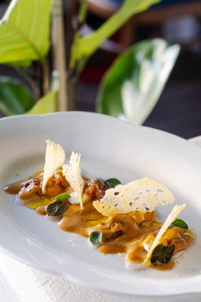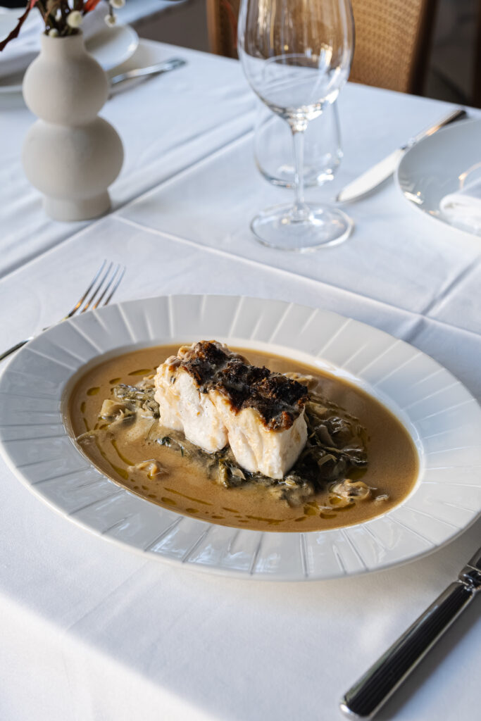 Πανέ μάγουλο πεσκανδρίτσας με χειροποίητη μαγιονέζα, μια σύνδεση με τις παιδικές αναμνήσεις των fishsticks με μαγιονέζα σε επίπεδο fine dining. Φιλέτο (αγαπημένης) σκορπίνας με τσιγαριαστά χόρτα, ντομάτα και λεμόνι.