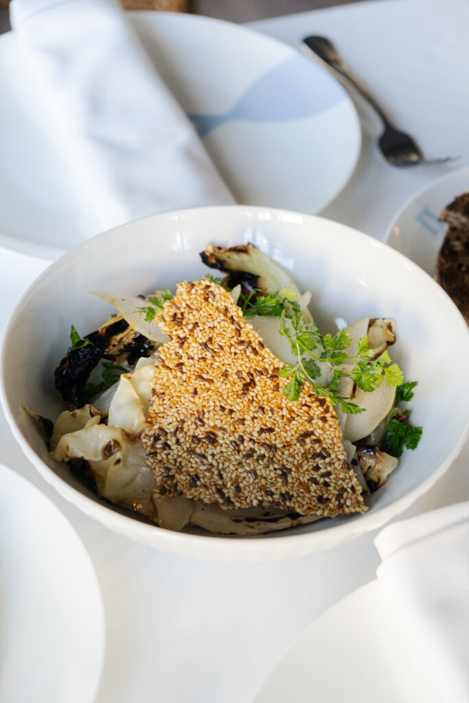 Στη συνέχεια, ήρθε ένα από τα σουξέ των τελευταίων χρόνων στα εστιατόρια, που τα vegan μπήκαν στη ζωή μας. Ψητό λάχανο, με κράκερ σουσαμιού και σπόρων, λιαστή τομάτα, αχλάδι, τσίλι και τυρί Σαν Μιχάλη, σε ένα παιχνίδι υφών, αρωμάτων και γεύσεων με μικρές εκπλήξεις αλλά υποδειγματική ισορροπία, που μας κέρδισε από τις πρώτες πιρουνιές.