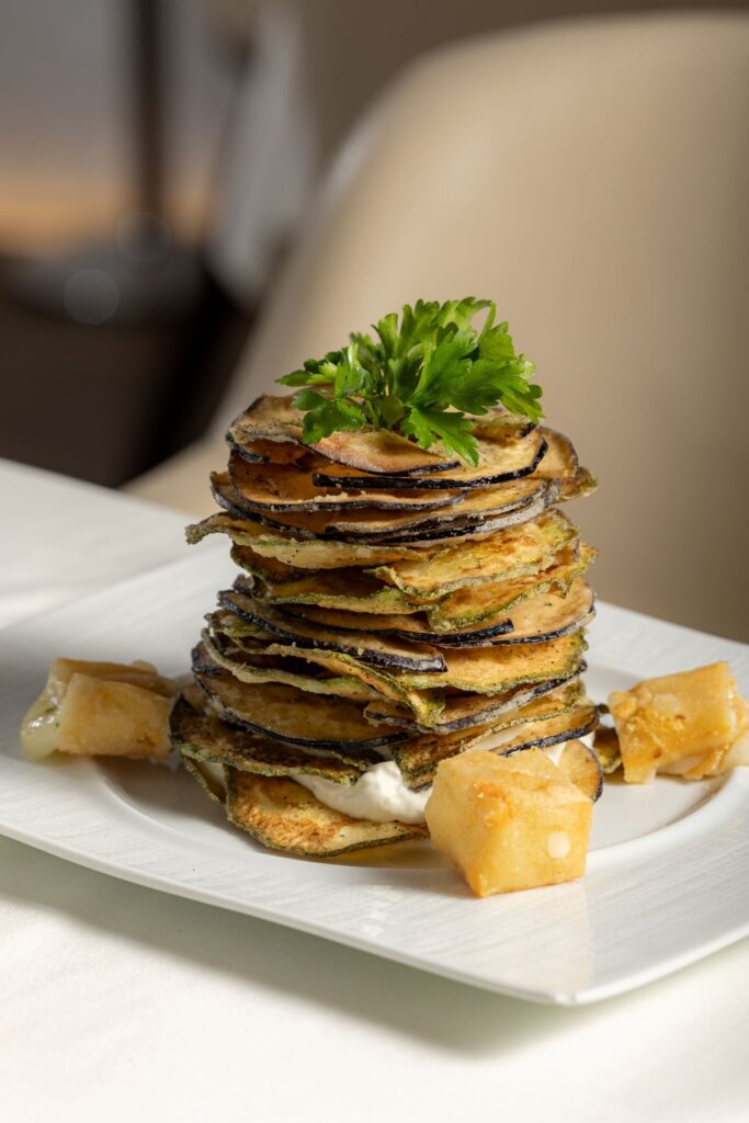 Και έπειτα, ένα ψάρι ψημένο στην πένα, με τη σάρκα του ζουμερή και τη γεύση του βαθιά, θαλασσένια, χωρίς καμία υπερβολή. Και, φυσικά, το περίφημο Milos Special —λεπτές φέτες μελιτζάνας και κολοκυθιού, τηγανισμένες και στρωμένες με τυρί κρέμα — έρχεται σαν ένα πιάτο που ισορροπεί ανάμεσα στη μνήμη και στη σύγχρονη εκδοχή της.