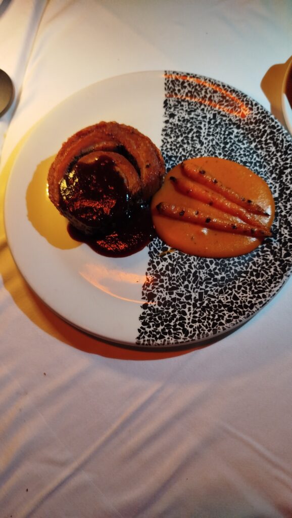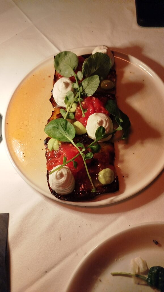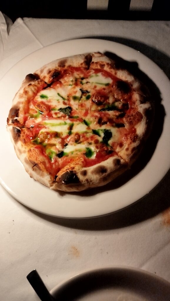 Beef carpaccio και tartar, vitello tonnato με καλομαγειρεμένο κρέας και δεμένη σάλτσα τόνου αλλά και μια ψητή μελιτζάνα με νεροκάρδαμο, ντομάτα, βασιλικό και ρικότα που πρώτη φορά δοκιμάζαμε και βρήκαμε γοητευτικά αρωματική συνθέτουν την πλειοψηφία των πρώτων επίλογων. Η πίτσα φτιάχνεται με ζυμάρι 24ωρης ωρίμανσης εύπεπτη με καλοσχηματισμένο στεφάνι cornicione) με μικρότερη κυψέλωση και ελαφρύ πάχος στην επιφάνεια με όλες τις κλασικές συνταγές να φωνάζουν παρών, ενώ η τραγανή πορκέτα με καρότο και σάλτσα πορτοκαλιού και η tagliata με πολέντα, τρούφα και παρμεζάνα πρωταγωνιστούν στην κατηγορία κρέας.