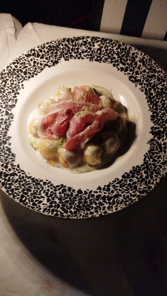 Ο executive chef του ομίλου Δημήτρης Σταμούδης και ο chef de Cuisine Γιάννης Σοφιανός βουτούν βαθιά στα ιερά της ιταλικής παράδοσης των ζυμαρικών τολμώντας να αναμετρηθούν με επιτυχία με συνταγές, όπως μια amatriciana (παρόλο που το guanciale είχε αντικατασταθεί από καπνιστή πανσέτα) ή μια cacio e pepe με καλοσχηματισμένη κρέμα από Pecorino Romano και το νερό του βρασμού των μακαρονιών. Στις πρώτες γραμμές ενός περιεκτικού καταλόγου φιγουράρει ένα από τα γευστικά σουξέ του: τα gnocchi. Δεν θα τα δείτε να λείπουν σχεδόν από κανένα τραπέζι. Βούτυρο φασκόμηλου, prosciutto, κρέμα παρμεζάνας και αμύγδαλο και στο κέντρο αυτά τα τροφαντά μπαλάκια από πατάτα.