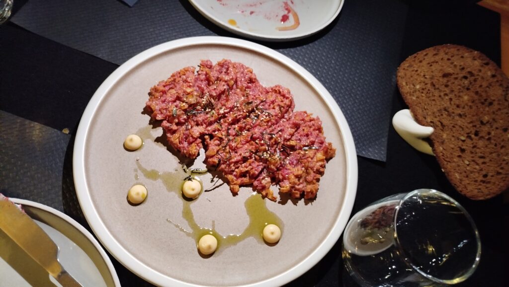 Από τον κατάλογο δεν λείπουν και οι δημοφιλείς ωμοφαγικές συνθέσεις, με παγκόσμιο χαρακτήρα σαν το μαγιάτικο με έναν έξυπνα αρωματικό και δροσερό ζωμό μανταρινιού, βασιλικού και αγγουριού κάθε και οι, επίσης, δημοφιλείς κοπές κρεάτων που κρατούν ένα, σχετικά μικρό, section στο μενού. Η pastry chef Νάντια Μακρυγιάννη παίζει δημιουργικά με συνταγές από το παγκόσμιο ρεπερτόριο όπως ένα banoffee, μια Crème Brulé & μια Black Forest καθώς μετασχηματίζει την παραδοσιακή τους μορφή διακριτικά και με γευστική επιτυχία.