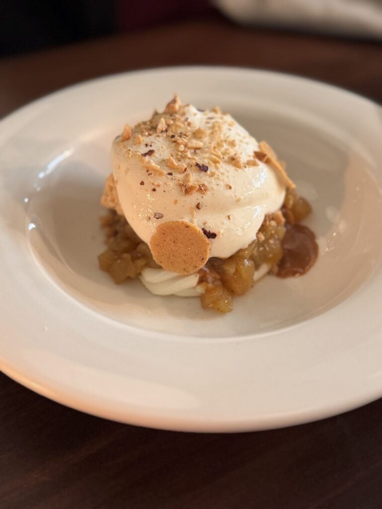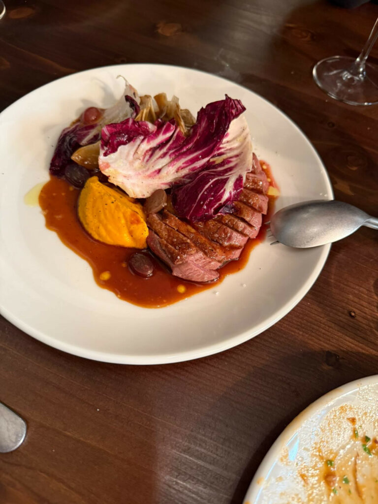 Στο ίδιο πνεύμα κινείται και η πάπια με σος hoisin, gyoza γεμιστή με πιάπια και πουρέ καρότου, πιάτο που ισορροπεί ανάμεσα σε ανατολίζουσες επιρροές και οικεία γεύση. Κοινός παρονομαστής σε όλο το μενού οι καθαρές γεύσεις και η σύνδεση με το διπλανό αρτοποιείο, από το οποίο προέρχεται και το ψωμί που συνοδεύει τα πιάτα.