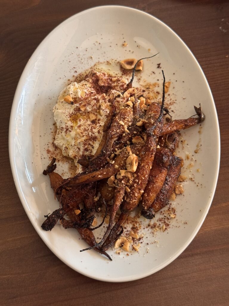 Κεντρικός «παίκτης» της κουζίνας είναι ο φούρνος josper, ο οποίος ψήνει με κάρβουνο, προσδίδοντας ένταση και βάθος στη γεύση. Από τα πιάτα που δοκιμάσαμε, τα ψητά καρότα με στρατσιατέλα, φουντούκι και σουμάκ είναι ένα παράδειγμα του πώς μια απλή πρώτη ύλη μπορεί να αναβαθμιστεί μέσα από σωστή τεχνική.