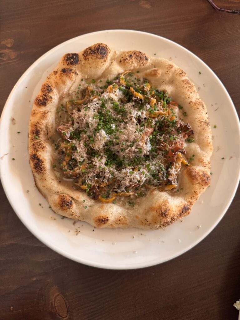 Το flatbread με άγρια μανιτάρια, σκόρδο και φασκόμηλο αξιοποιεί τη ζύμη του bakery, ενώ το μοσχαρίσιο ραγού με udon noodles και κεφαλογραβιέρα προτείνει μια διαφορετική ανάγνωση στα «μακαρόνια με κοκκινιστό κρέας».